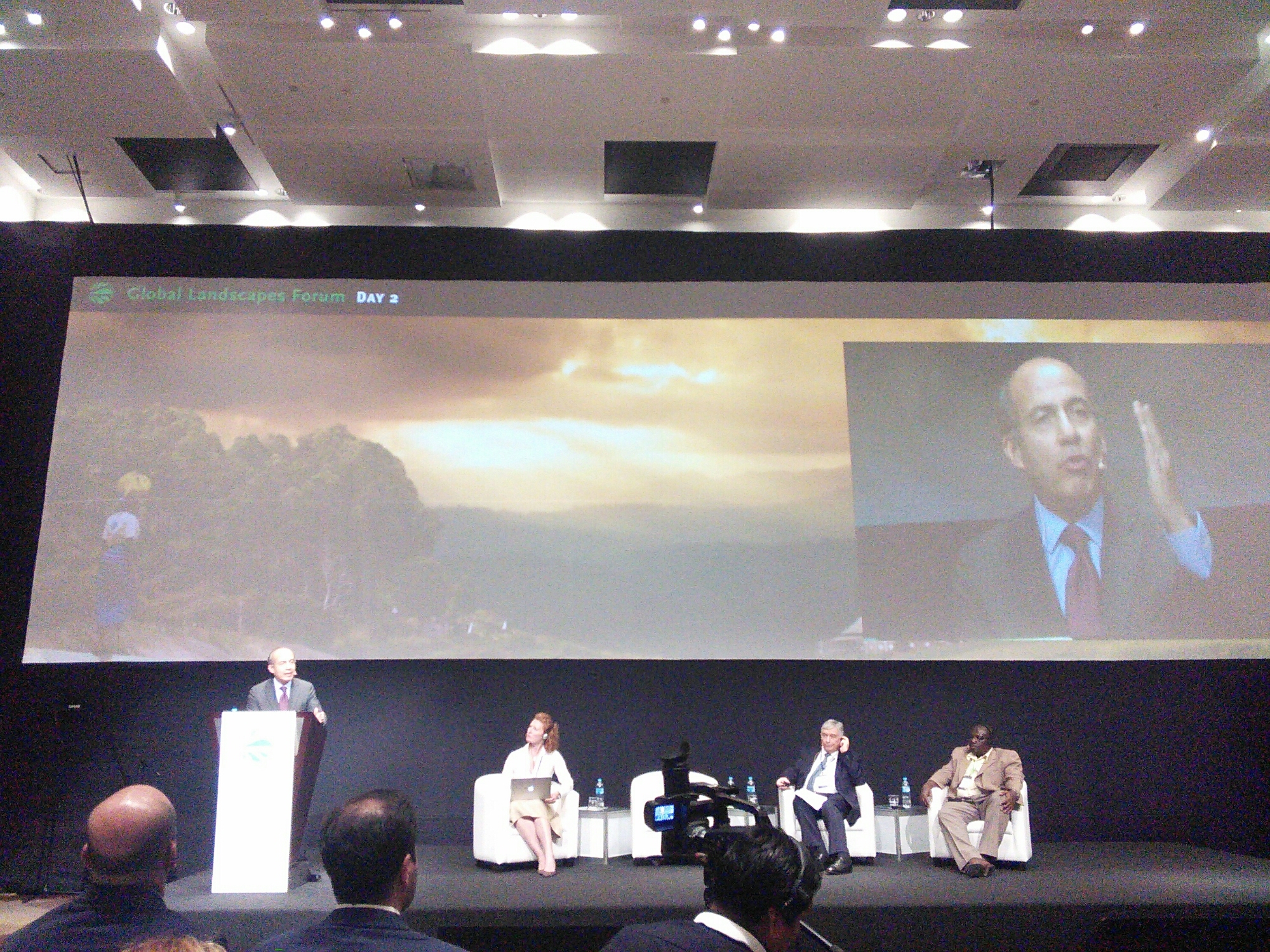 El ex-Presidente de México Felipe Calderón compartió unas palabras con el GLF en donde defendió la idea que el desarrollo sostenible y el crecimiento económico pueden ir de la mano. Hizo hincapié que el manejo de paisajes no puede tomar únicamente el aspecto ambiental sino que debe considerar el desarrollo socio-económico de las personas. Pueden ver parte de sus declaraciones en nuestro canal de YouTube = Felipe Calderón #GLF crecimiento y cambio climático: http://youtu.be/WnEzmz-WwSo
